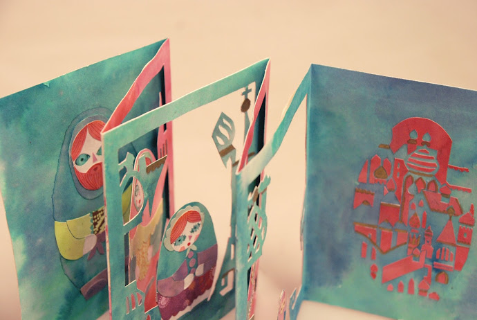 Une petite famille de matriochkas, de poupées russes, en papier découpé pour s'amuser avec le motif et la transparence. Ça a la forme d'un piti livre dépliant qu'on peut regarder dans tous les sens (c'est ludique tavu) et il y a un chat.